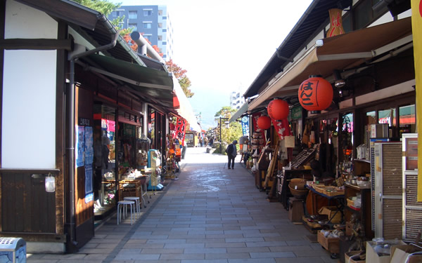 松本城の南惣堀(みなみそうぼり)と女鳥羽川(めとばがわ)の清流に挟まれて、 『縄のように長い土手』ということから由来している縄手通り商店街は、江戸期の城下町松本の風景を再現しています。 50近く並ぶ各店舗は懐かしい玩具や古民具・骨董のほか、駄菓子や飲食物を売り、見ているだけで楽しくなるそぞろ歩きコースです。